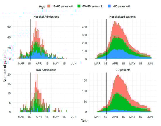 There were 1321 patients admitted to the participating hospitals for COVID-19 between 1 January and 31 May 2020 (Table 1). The first patient was admitted on 24 February, and the last on 19 May. The hospital admission curve peaked on 27 March, 10 days after the national lockdown, with 70 daily admissions (Figure 1). The peak in admission to the ICU was 2 days later, on 29 March, with 20 admissions. The maximum number of beds occupied in the hospital was 473 over the period, of which 178 beds (38%) were in intensive care. During this period, the number of ICU beds for COVID-19 patients exceeded the usual medical ICU capacity by 120%. Approximately one third of the patients were more than 80 years old, and 40% were less than 65 years old. There were slightly more men than women, except in the oldest age class.