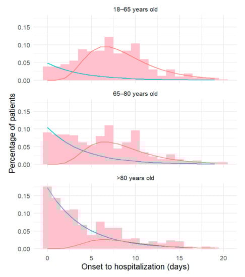 Time from onset to hospitalization according to age. The lines correspond to the two components of the mixture analysis: slow progressor (red), rapid progressor (blue). Histogram is shown in pink.