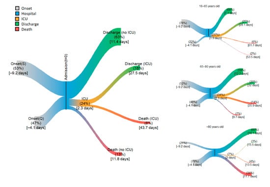 Summary of patient trajectories from onset to admission. Time flows from left to right. Onset (S) are slow progressors, Onset (Q) are quick progressors. The width of the branches is proportional to the percentage of patients. Branches end at the average length of stay in each ward. Left side: All patients, right side, top to bottom, age groups: 18–65 years old, 65–80 years old, >80 years old.