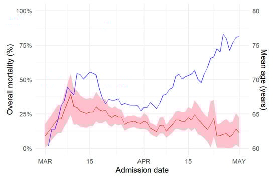 Mortality rate (red) and mean age (blue) at date of hospital admission. Mortality rate was corrected for censoring (shaded area is 95% confidence interval).