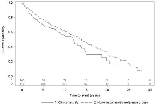 Unadjusted Kaplan-Meier curves for overall mortality in relation to clinical versus non-clinical anxiety levels (including number of participants at risk over time).