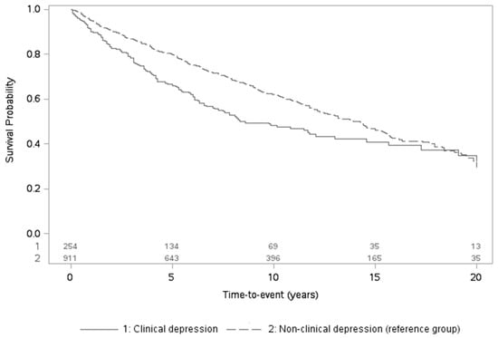 Unadjusted Kaplan-Meier curves for overall mortality in relation to clinical versus non-clinical depression levels (including number of participants at risk over time).