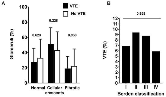Kidney biopsy histology according to early venous thromboembolism (VTE) occurrence. (A) percentage of normal, crescentic, or sclerotic glomeruli in patients with and without early VTE. (B) percentage of patients with VTE according to Berden’s classification. I, focal; II, crescentic; III, mixed; and IV, sclerotic form.