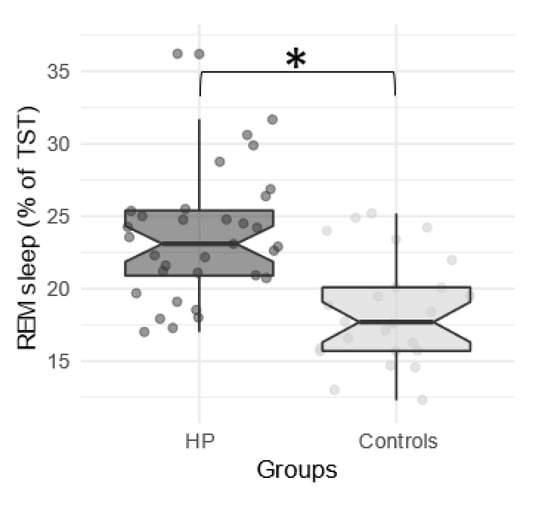 Each point represents the median Rapid Eye Movement (REM) sleep percentage for each subject according to the group (High Potential (HP) vs. controls). The central line of the boxplot corresponds to the median; the upper and lower parts correspond to the first and third quartiles. Difference between groups is represented by a star: * p < 0.05.