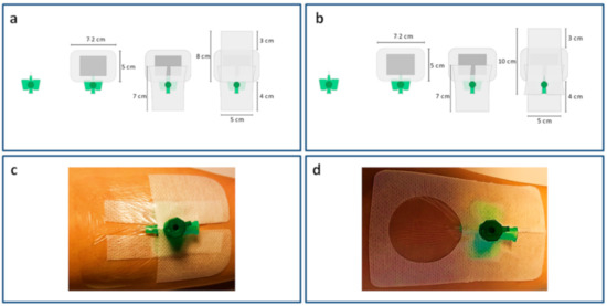 - A sterile absorbent wound dressing (Leukomed®, BSN medical, Hamburg, Germany; 7.2 × 5 cm) placed onto the insertion site, covered and overlapped by two rectangular elastic polyester fleece dressings (Fixomull® stretch, BSN medical, Hamburg, Germany). One of these dressings was incised to secure the wings of the i.v. cannula. The second dressing was taped without incision.