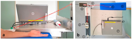 Experimental setup: (a) cord attached to truncated cannula; (b) view from above: 1, crank handle; 2, force transducer; 3, deflection roller; 4, angle meter; 5, Luer lock connector; 6, arm rest; 7, laptop for data processing.