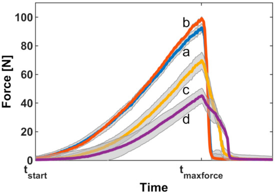 Development of dislodgement forces of four securements. Individual curves were aligned to the time points at which the force application started (tstart) and at which the maximal force was present (tmaxforce). Shaded areas represent the 95% confidence intervals: a, sterile wound dressing covered by two elastic polyester fleece dressings, one incised; b, sterile wound dressing covered by two elastic polyester fleece dressings, both incised; c, non-bordered transparent polyurethane film dressing; d, bordered polyurethane film dressing (nonwoven polyester with polyurethane film laminate.