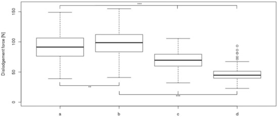 Dislodgement forces of four securements: a, sterile wound dressing covered by two elastic polyester fleece dressings, one incised; b, sterile wound dressing covered by two elastic polyester fleece dressings, both incised; c, non-bordered transparent polyurethane film dressing; d, bordered polyurethane film dressing (nonwoven polyester with polyurethane film laminate). Box plots indicate medians, interquartile range 25–75 and range without outliers (whiskers). Circles show outliers. ** = p < 0.01, *** = p < 0.001.