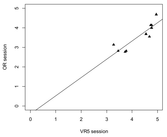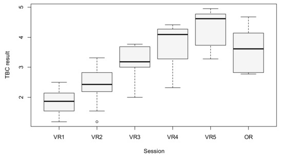 Statistical analysis was carried out in R software, version 3.5.1, 2018 (http://cran.r-project.org), The R Foundation for Statistical Computing Institute for Statistics and Mathematics, Vienna, Austria. Normality of TBC data was confirmed based on Shapiro–Wilk test results, as well as based on skewness and kurtosis values and visual assessment of histograms. TBC results between sessions were compared with MANOVA, a Mauchly test was used to check data sphericity, and Greenhouse–Geisser and Huynh–Feldt corrections for departure from sphericity were applied. To identify specific sessions that had a significantly different TBC result, a post-hoc test was used (a paired t-test with Bonferroni correction for multiple comparisons). Correlation between the last VR session and the OR session for TBC was analyzed with Pearson’s correlation coefficient (rp). The intraclass correlation coefficient (ICC) was computed to assess the agreement between the two raters. All tests were based on α = 0.05.
