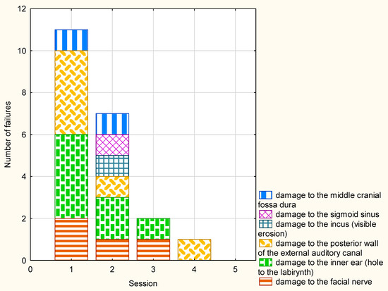 In consecutive VR sessions, the number of mistakes was evidently reduced. Altogether, 11 mistakes were observed in the participants’ first session (among them, two injuries of the facial nerve and four injuries of the inner ear). No mistakes were observed in their fifth session. The number and characteristics of the failures are presented in Figure 4.