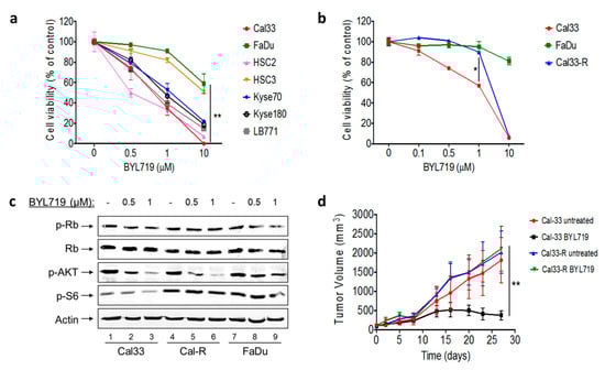 Mechanism of acquired resistance to phosphoionositide 3 kinase (PI3K) inhibition (a) Cell viability curves of different head and neck squamous cell carcinoma (HNSCC) and esophageal SCC cell lines (PIK3CA mutated, amplified, and wild type) treated with BYL719. (b) Cell viability curves of Cal33, FaDu, and Cal33-R cell lines treated with BYL719. (c) Signaling pathway protein expression in Cal33, Cal33-R, and FaDu cell lines treated with BYL719. (d) Tumor growth curves of Cal33 and Cal33-R cell line xenografts treated for 27 days with daily oral administration of either 50 mg/kg BYL719 or vehicle (n = 8). (* p < 0.05, ** p < 0.01).