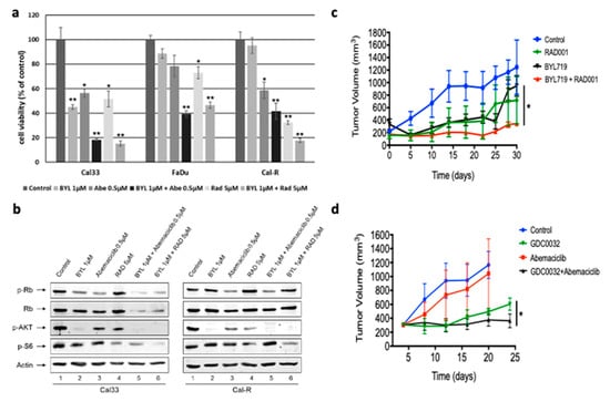 Overcoming resistance to PI3Ki by blocking mammalian target of rapamycin complex 1 (mTORC1) or cyclin D1 kinase (CDK) 4/6. (a) Cell viability curves of Cal33, FaDu, and Cal33-R cell lines, treated with either BYL719, abemaciclib, or RAD001 monotherapy or combination. (b) Signaling pathway protein expression in Cal33 and Cal33-R cell lines, treated with either BYL719, RAD001, and abemaciclib monotherapy or combination therapy. (c) Tumor growth curves of H22 patient-derived xenografts treated for 30 days with daily oral administration of either 50 mg/kg BYL719, 0.5 mg/kg RAD001, or a combination of both drugs (n = 10). (d) Tumor growth curves of H22 patient-derived xenografts treated for 25 days with daily oral administration of either 5 mg/kg GDC0032, 50 mg/kg abemaciclib, or a combination of both drugs (n = 10). (* p < 0.05, ** p < 0.01).