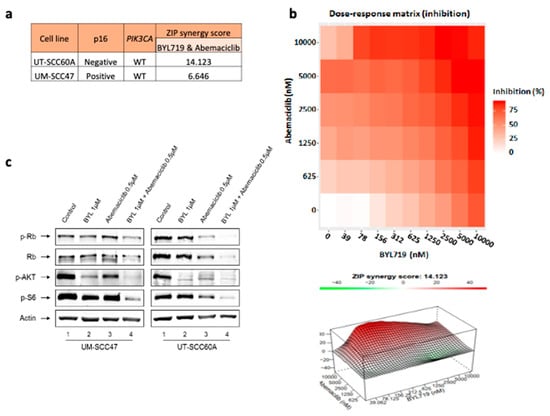Aiming to understand the molecular mechanism behind the observed synergistic phenotype, we performed WB analysis following dual exposure to BYL719 and abemaciclib. We saw enhanced inhibition of the PI3K/Akt/mTOR and Rb pathways, as indicated by pS6, pAKT, and pRB following administration of the drug combinations in p16- UT-SCC60A and to a lesser extent in p16+ UM-SCC47 (Figure 4c).
