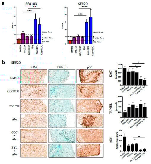 Combination of PI3K and CDK 4/6 inhibitors display synergistic effect in a patient-derived xenograft (PDX) tumor ex-vivo analysis (TEVA). (a) TEVA score analysis of SE#20 and SE#103 at 24 h following exposure to either BYL719, GDC0032, and abemaciclib monotherapy or combination therapy. (b) Representative images of immunohistochemistry staining for KI67, TUNEL, and pS6 in SE#20. (* p < 0.05, ** p < 0.01, *** p < 0.001, **** p < 0.0001).