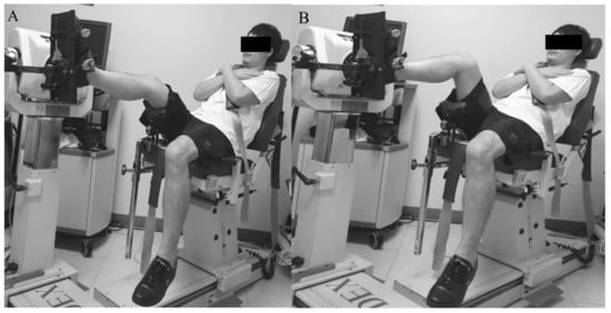 The strength of isokinetic knee extension/flexion (concentric/concentric mode, Nm kg−1 × 100) was measured in a seated position on a quantified isokinetic device (Biodex MultiJoint System 4, Biodex Medical Systems Inc., Shirley, NY) with 90° flexion of the hip and knee joints. Each test consisted of 5 repetitions of extension/flexion (ROM, 90° to 0°) for each leg (injured leg and uninjured leg, respectively) at 180°/s with a resting time of 30 s between the tests. Flexor and extensor strengths were regarded as hamstring and quadriceps muscles strengths, respectively (Figure 2).