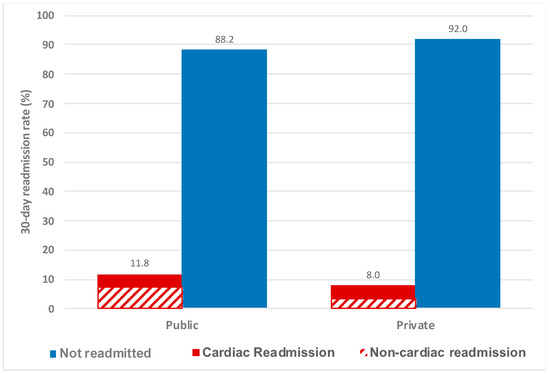 Our study cohort included 28,488 patients who underwent PCI during the study period and were successfully linked to VAED. Overall, the mean age was 67.2 ± 12.2 years and 6783 patients (23.8%) were female. Of the total cohort, 3059 patients (10.7%) had an unplanned hospital readmission. The primary cause of readmission was cardiac in nature in 1848 out of the 3059 patients (60.4%) who were readmitted. Of the cardiac readmissions, the vast majority were due to either ischaemic heart disease or cardiac signs and symptoms without a specific diagnosis. Out of the non-cardiac readmissions, the three most common causes for readmission were gastrointestinal disorders, respiratory disorders and injury or poisoning (Figure 1). Overall, the 30-day readmission rate was higher in public hospitals compared to private hospitals (11.8% vs. 8.0%; p < 0.001) (Figure 2).