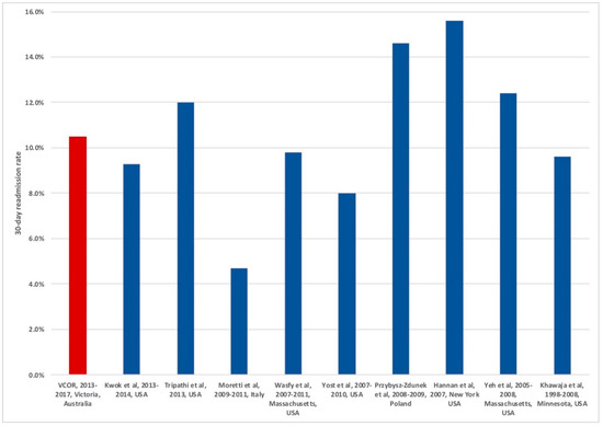 Comparison of 30-day readmission rates post-percutaneous coronary intervention across various studies. Note: Studies on x-axis denoted by first author, study inclusion dates and location of hospitals studies; the present study is highlighted in red.