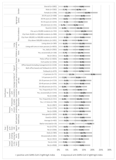 There were no current SARS-CoV-2 infections among 5082 police employees in this study (all RT-PCR tests were negative). The anti-SARS-CoV-2 IgM+IgA index was positive (>8) in 8.9% of participants (95%CI: 8.1–9.7%) overall, in 11.2% (95%CI: 9.7–12.7%) of women, and in 7.7% (95%CI: 6.8–8.6%) of men (p < 0.001). An equivocal (6–8) anti-SARS-CoV-2 IgM+IgA index was found in 9.8% (95%CI: 9.0–10.6%) of participants, with a significant difference (p < 0.001) between women (11.9%; 95%CI: 10.4–13.5%) and men (8.7%; 95%CI: 7.8–9.7%) (Figure 1). The size of the place of residence also differentiated results in a statistically significant way (p < 0.01). No other variable listed in Figure 1 was significantly associated with the IgM+IgA results.