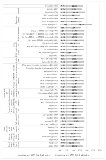 Overall, 4.3% participants (95%CI: 3.7–4.9%) were IgG-seropositive (antibody index > 6). An equivocal (4–6) anti-SARS-CoV-2 IgG index was found in 13.2% (95%CI: 12.3–14.1%) of participants. Neither sex (p = 0.155) nor other variables listed in Figure 2 were significantly associated with the IgG results (Figure 2).