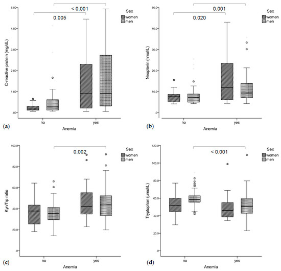(a) Anemic patients had significantly higher C-reactive protein (b) and neopterin concentrations. (c) Anemic men also had a higher Kyn/Trp ratio (d) and lower tryptophan concentrations.