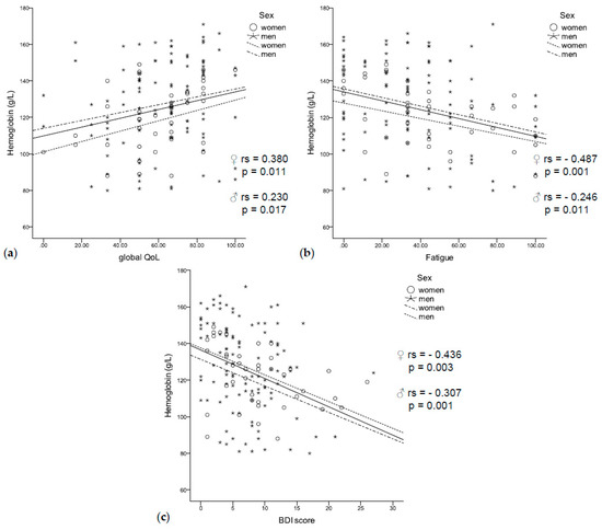 (a) Low hemoglobin concentrations were related to a worse quality of life, (b) fatigue, (c) and a higher BDI score independent of sex.