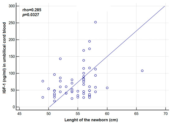 Table 1 presents a comparison of the study group (GDM) and the control group (C). The analysis of the concentrations of both IGF-1, -2 and IGFBP-3 in peripheral blood and umbilical cord blood showed no statistically significant difference between the GDM group and the Cgroup (Table 2). A significantly lower concentration of IGFBP-1 in peripheral blood (p = 0.0001) and umbilical cord blood (p = 0.0443) were shown in the GDM group compared to the C group. The above, statistically significant differences were confirmed only for patients with BMI < 25 (p = 0.0003 and p = 0.0476, respectively). A significantly lower concentration of IGFBP-2 in peripheral blood (p = 0.0217) and umbilical cord blood (p = 0.0001) was shown in the GDM group compared to the C group. The above relationships were confirmed only for patients with BMI < 25 (p = 0.0217 and p = 0.0001, respectively). A statistically significantly higher level of insulin (p = 0.0210) in the peripheral blood of women with GDM compared to healthy women was demonstrated (the above relationship was not confirmed in BMI subgroups); the analysis of the concentration of peripheral blood glucose in women with GDM and in healthy women showed no significant difference (p = 0.1117). There was also observed a significantly higher median of the indicator value HOMA-IR in the GDM group compared to the C group (5.69 vs. 4.37; p = 0.0150). However, this relationship was confirmed only in BMI > 24.99 (6.37 vs. 3.40; p = 0.0017) (Table 2). A significantly higher level of IGF-1 (p = 0.0436) was found in the cord blood of newborns delivered by women suffering from GDM, who had been on a diet vs. insulin. Correlations between maternal and cord plasma IGF-1, IGF-2, IGFBP-1-3 concentrations and clinical/biochemical parameters in the GDM group are presented in Table 3 and Table 4. A statistically significant positive correlation was observed between the weight gain during pregnancy and the concentration of IGF-2 in the peripheral blood of women with GDM (rho = 0.263; p = 0.0433), as well as between the concentration of IGF-1 (ng/mL) in the serum of umbilical cord blood of newborns delivered by women with GDM, and the newborn length soon after birth (rho = 0.285; p = 0.0327) (Figure 1). A statistically significant positive correlation was observed between the concentration of IGF-1 and IGF-2 in the peripheral blood of women with GDM and the IGF-1 concentration (rho = 0.352; p = 0.0069), and the concentration of IGF-2 (rho = 0.644; p < 0.0001) in the serum of umbilical cord blood of newborns delivered by women with GDM. In the study group, the drop in IGFBP-2 concentration in maternal blood was accompanied by an increase of IGF-2 in newborn’s cord blood (rho = −0.367, p = 0.0049). There was a statistically significant negative correlation between the value of the indicator HOMA-IR, and the concentration of IGFBP-2 in the umbilical cord blood of newborns delivered by healthy women (rho = −0.28; p = 0.0487). However, in the GDM group, such a relationship was not found. Comparisons of different IGF concentrations according to weight classification based on BMI were performed with the use of ANOVA Kruskal–Wallis test. There were no statistically significant differences in the concentrations of the tested laboratory markers depending on adult body weight classification based on BMI. Only in the case of IGFBP-1, some trend towards significantly higher values of this marker was noted in women with GDM and BMI < 25 (with desirable body weight) compared to the subjects with BMI > 24.99 (overweight) and BMI > 29.99 (obese) (118.06 vs. respectively: 72.77 and 62.40; p = 0.0548) (Table 5).