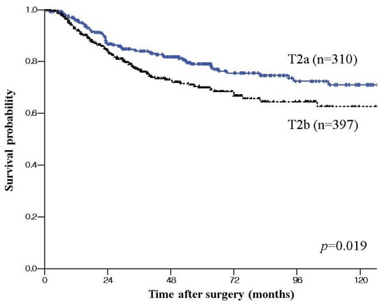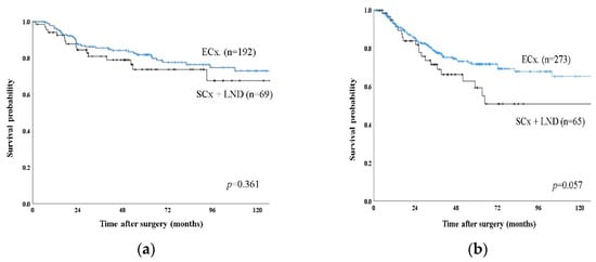 The 5-year disease-specific survival rate for the patients with T2a GBC was 74.8%, while that for patients with T2b GBC was 65.4% (p = 0.019) (Figure 1). After exclusion of 108 patients with Nx disease, 599 patients were included in a further sub-analysis. There was no significant difference in 5-year disease-specific survival rate between T2aN0 (Stage IIa) and T2bN0 (Stage IIb) (87.6% vs. 79.9%, p = 0.190) and between T2aN1 and T2bN1 (60.2% vs. 56.9%, p = 0.433). T2aN0 (Stage IIa) or T2bN0 (Stage IIb) showed significantly better survival than Stage IIIb (T2N1) (87.6%, 79.9% vs. 58.0%, p < 0.001). Comparing survival according to operation, there was no significant difference in 5-year disease-specific survival rate between ECx and SCx with LN dissection for T2a tumor (81.8% vs.73.7%, p = 0.361) (Figure 2a). However, there was a better survival trend without statistical significance for T2b tumor in ECx than in SCx+ LN dissection (71.7% vs. 59.3%, p = 0.057). (Figure 2b). Adjuvant chemotherapy was associated with improved overall survival only for patients with LN metastasis in T2a tumor (72.1% vs. 56.9, p = 0.022) and in T2b tumor (68.2 vs. 48.5, p < 0.001).