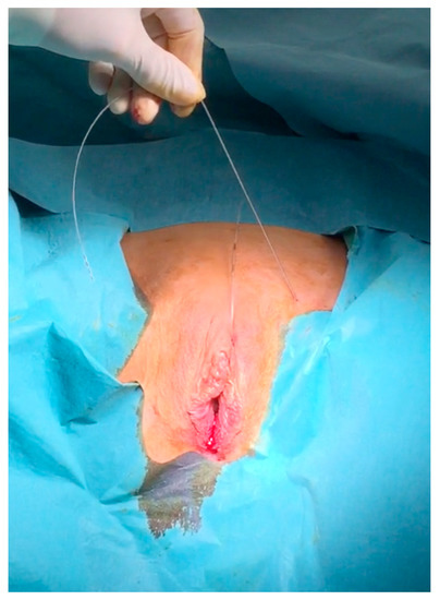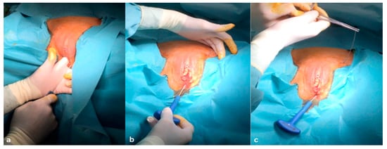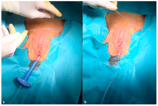 Through a second median supravulvar incision, the applicator with the spear is introduced from top to bottom so that it is as deep as possible (ventral to the pubic bone but as close as possible to it in order to assure the deep location of the cable electrode) and emerges through the first vulvar incision. After removing the spear, the electrode cable is inserted retrograde into the applicator again (Figure 5a–c).