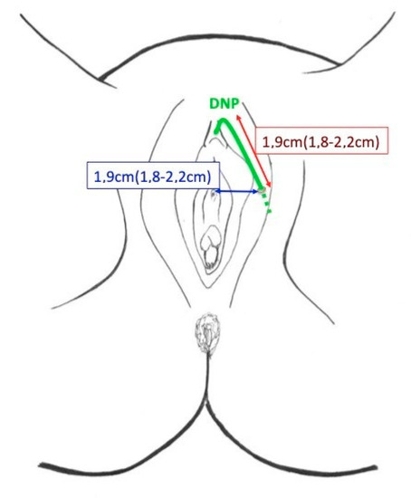 To use the hollow needle driver for the retrograde introduction of the lead electrode enables the optimal placement of the lead electrode to the genital nerves without the need for any dissection, which, in turn, reduces considerably the risk of bleeding and nerve injury. The introduction of the curve needle driver from below belongs to standard urogynecology (TVT) procedure. As the (dorsal Nerve of The Penis/Clitoris) DNP perforates the perineal membrane laterally to the external urethral meatus at an average distance of 2.7 cm (2.4–3.0 cm) and then runs along the bulbous spongy muscle for a distance of 1.9 cm (1.8–2.2 cm) before penetrating the pillars of the clitoris (Figure 7), the second passage of the lead electrode in front of the pubis ensures direct contact of the electrode to the DNP [25].