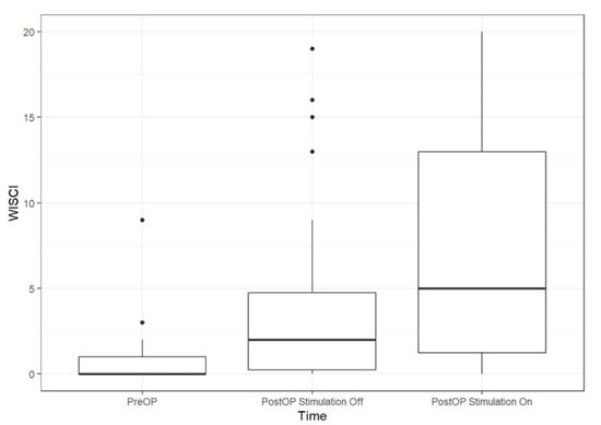 Boxplots of WISCI (Walking index for spinal cord injury) pre-operatively and at the 11/2018 follow-up. The line in the box shows the median, the lower and upper hinges correspond to the first and third quartiles and the upper/lower whisker extends from the hinge to the largest/smallest value no further than 1.5 IQR from the hinge (where IQR is the inter-quartile range).