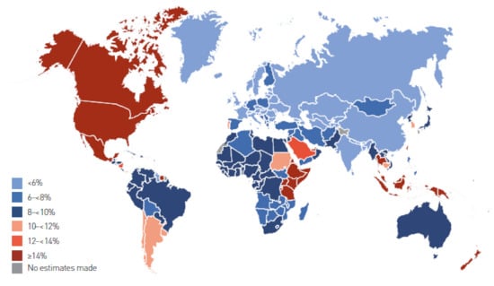 Age-adjusted comparative prevalence of impaired glucose tolerance in adults (20–79 years) in 2019, adapted from International Diabetes Federation. IDF Diabetes Atlas, 9th edn. Brussels, Belgium [2].