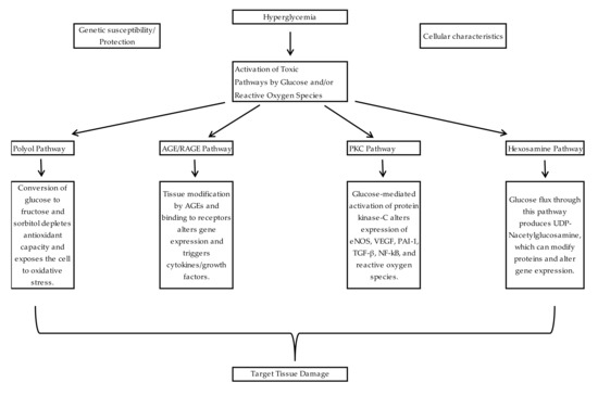 - Brownlee, M. The pathobiology of diabetic complications: A unifying mechanism. Diabetes 2005, 54, 1615–1625. [Google Scholar] [CrossRef]