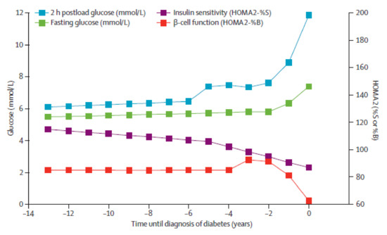 As was proven in studies analyzing dependencies of repeated tests of glucose levels with insulin secretion and sensitivity to insulin, the development of diabetes is a continuous process. In the Whitehall II study, in people who developed diabetes, increased glucose levels were observed as early as 13 years before the diagnosis, although glucose values seemed precisely regulated within the correct range up to 2–6 years before the diagnosis, until their sudden increase [24]. This was also confirmed in other studies [25,26,27]. Sensitivity to insulin was already lowered 13 years before the onset of DM, while its steep decrease occurred 5 years before the diagnosis. Insulin secretion (β-cell function) remained at the same level for 13 years during the observation period, 3–4 years before the diagnosis there occurred a compensational increase of insulin secretion, while immediately before the diagnosis there was a sudden decrease [23]. These results confirm the hypothesis that insulin resistance emerges a number of years before DM, and the reduction of β–cell function appears already in a prediabetic state [20,28] (Scheme 1).