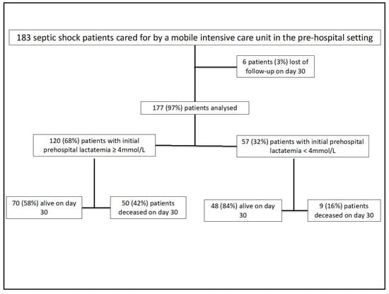 Blood lactate measurements (BLM) from 177 patients with SS were collected in this observational study. The mean pre-hospital lactatemia in the study population was 6.3 ± 3.7 mmol/L and differed significantly between living and deceased patients (5.9 ± 3.5 mmol/L vs. 7.1 ± 4.0 mmol/L, respectively, p < 10−3). Pre-hospital hyperlactatemia ≥4 mmol/L was associated with a higher 30-day mortality than in patients with lactate < 4 mmol/L (40% vs. 16%; p < 0.001). Table 3 depicts the comparison between patient characteristics among those with initial pre-hospital lactatemia < 4 mmol/L and those with initial pre-hospital lactatemia ≥ 4 mmol/L.