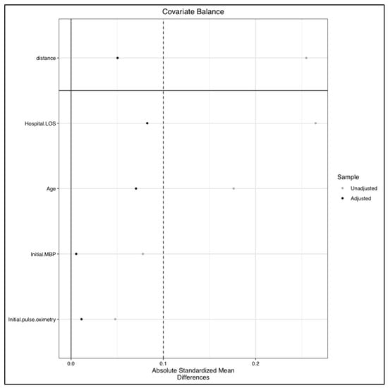 - Austin, P.C. Balance diagnostics for comparing the distribution of baseline covariates between treatment groups in propensity-score matched samples. Stat. Med. 2009, 28, 3083–3107. [Google Scholar] [CrossRef]
