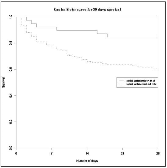 Using Cox regression analysis, we observed a statistically significant association between pre-hospital lactatemia ≥ 4 mmol/L and 30-day mortality with a hazard ratio (HR) of 2.27 (95%CI (1.02–5.05), p = 0.04). Differences in 30-day survival after confounder adjustment in both subgroups was represented by Kaplan–Meier curves (Figure 3).