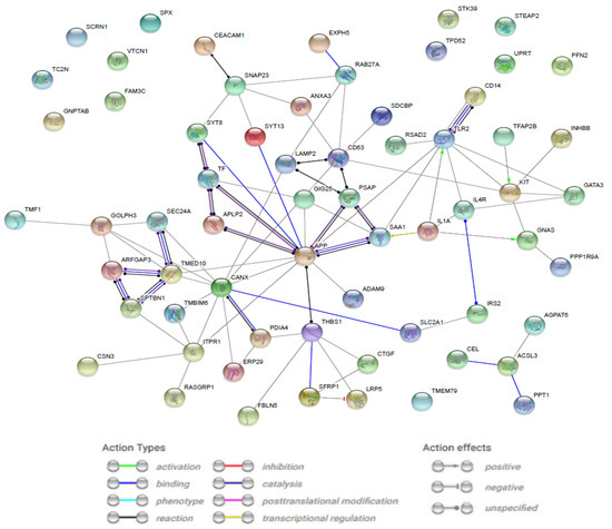 A STRING-generated interaction network was created with differentially expressed genes belonging to the “secretion” GO BP term. The intensity of the edges reflects the strength of the interaction score (Figure 2).