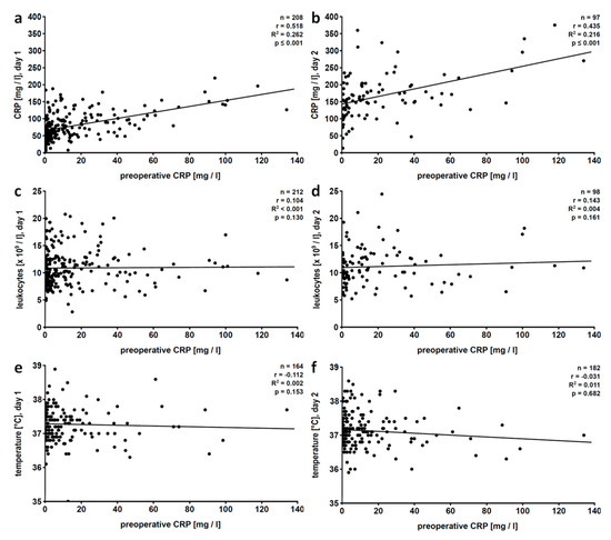 As expected, CRP levels, leukocyte counts and body temperature increased in the early postoperative phase (Figure S1a–c). Linear regression analysis of preoperative versus postoperative CRP values revealed a positive correlation at all postoperative days (days 1 to 10), and correlation coefficients continuously dropped (Table 2, Figure 2a,b). In contrast, preoperative CRP levels and postoperative leukocyte numbers did not correlate on days 1 to 2 and 6 to 10; only a weak positive correlation was seen on days 3 to 5 after surgery (Table 2; Figure 2c,d). Body temperature did not correlate at all with preoperative CRP values (Table 2; Figure 2e,f). Of note, only few patients suffered from body temperatures below 36 °C throughout the study (Figure S1c).