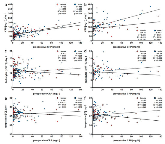 Much like in the entire patient population, preoperative CRP positively correlated with postoperative CRP values in male patients on days 1 to 5 and on day 8 as well as in female patients on days 1, 3, 4 and 5 (Table 3; Figure 3). In contrast to the total patient population, leukocyte counts weakly and positively correlated with preoperative CRP values on postoperative days 1 to 3 and on day 5 in male patients, whereas no such positive correlation was seen in female patients. Interestingly, a weak negative correlation of preoperative CRP and postoperative body temperature was seen on days 1 (r = −0.273, n = 61, p = 0.033) and 2 (r = −0.248, n = 67, p = 0.043) after surgery, exclusively in female patients.
