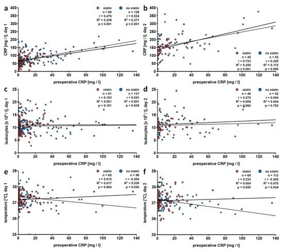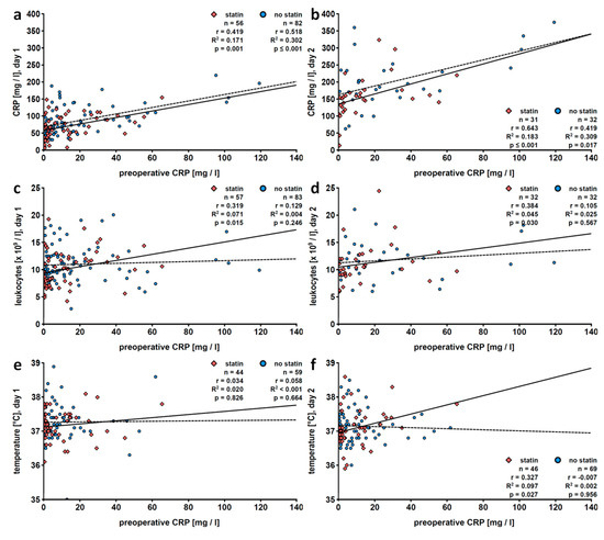 Next, patients were stratified according to treatment with statins and the characteristics of these subgroups are summarized in Table 4. Preoperative and postoperative CRP values positively correlated among patients with or without statin medication during most postoperative days investigated in this study (Table 5; Figure 4a,b). No correlation between preoperative CRP levels and postoperative leukocyte counts was seen, irrespective of stain intake (Table 5; Figure 4c,d). Interestingly, in patients who did not take statins, preoperative CRP and postoperative temperature negatively correlated on days 1 (r = −0.204, n = 99, p = 0.043) and 2 (r = −0.200, n = 113, p = 0.034; Table 5, Figure 4e,f).