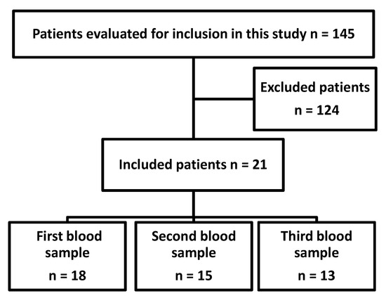 Upon written informed consent, 142 patients admitted to our hospital for a coronary angiography were evaluated for inclusion into this study. Three of them were excluded because they did not suffer from coronary heart disease and another 14 patients because of moderate or severe disease; 103 patients were excluded because of an intake of statins, anticoagulants, antibiotics or immunosuppressants and one patient was excluded because of ASA-intolerance. Finally, 21 patients were included in this study (Figure 7). However, six patients discontinued their participation before the second blood sampling and two before the third sampling (withdrawal of the consent or non-compliance). In total, 13 patients went through the entire study protocol (Figure 7). The characteristics of these patients are summarized in Table 8.