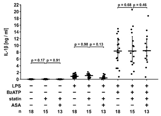 Release of interleukin-1β (IL-1β) by monocytes isolated from the blood of patients suffering from low-grade coronary heart disease. Patient blood was drawn before lipid-lowering medication, after four weeks of statin intake and after another four weeks of combined treatment with statin and acetylsalicylic acid (ASA). IL-1β was measured in cell culture supernatants of unstimulated cells, cells primed with lipopolysaccharide (LPS, 5 ng/mL, 3 h) or LPS-primed cells stimulated with 2′(3′)-O-(4-benzoylbenzoyl)adenosine 5′-triphosphate (BzATP, 100 µM, 30 min). Data are presented as individual data points; bar represents median; whiskers encompass the 25th to 75th percentile. Experimental groups were compared by the Friedman test followed by the Wilcoxon signed-rank test.