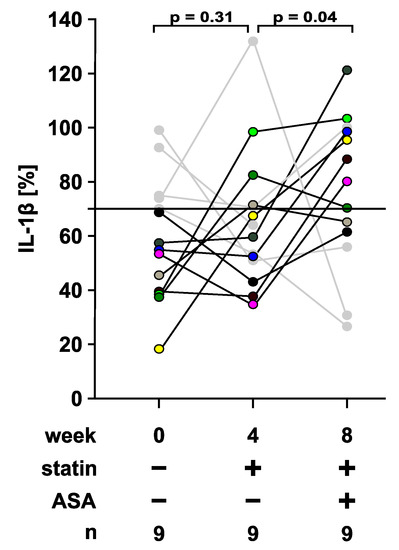 C-reactive protein (CRP)-mediated inhibition of the release of interleukin-1β (IL-1β) by monocytes of patients suffering from low-grade coronary heart disease. Patient blood was drawn before lipid-lowering medication, after four weeks of statin intake and after another four weeks of combined treatment with statin and acetylsalicylic acid (ASA). IL-1β was measured in cell culture supernatants of monocytes primed with lipopolysaccharide (LPS, 5 ng/mL, 3 h) and stimulated with 2′(3′)-O-(4-benzoylbenzoyl)adenosine 5′-triphosphate (BzATP, 100 µM, 30 min) in the presence or absence of CRP (5 µg/mL). IL-1β values obtained upon stimulation with BzATP were set to 100% and the values obtained in the presence of CRP were calculated accordingly. Data from patients who did not show a CRP-mediated inhibition of IL-1β release below 70% are depicted in grey and were not included in the statistical analysis. Data are presented as individual data points; data from individual patients are symbolized by different colors; data points belonging to the same individual are connected by lines; bar represents median; whiskers encompass the 25th to 75th percentile. Experimental groups were compared by Friedman test followed by the Wilcoxon signed-rank test.