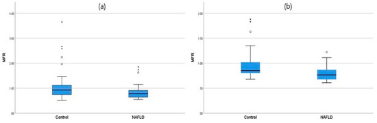 Box and whisker plot of median MFR (skeletal muscle-to-body fat ratio) in the control and NAFLD (non-alcoholic fatty liver disease) group in boys (a) and girls (b).