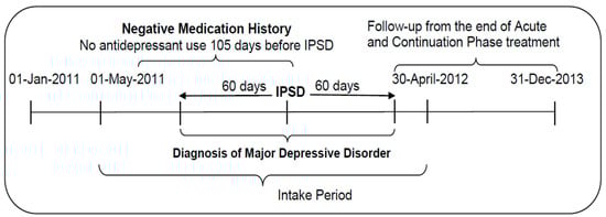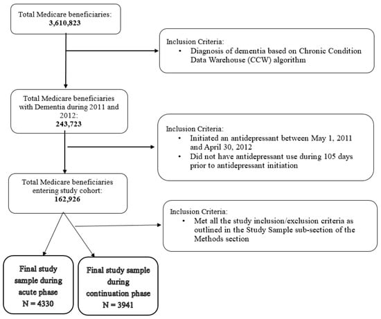 The study sample consisted of older adults aged 65 years and older with a diagnosis of dementia based on the Chronic Condition Data Warehouse (CCW) algorithm [15]. Based on the HEDIS guidelines [11], the intake period for new antidepressant medication use was from 1 May 2011, through 30 April 2012; the index prescription start date (IPSD) was the first date of an antidepressant prescription claim during the intake period. The 105 days preceding the IPSD was considered “baseline”. Index antidepressants included in this study excluded those deemed potentially inappropriate for older adults by the Beers [12] and STOPP [13] criteria. Medicare beneficiaries with a pharmacy claim for either new or refill prescriptions for an antidepressant medication during the baseline were excluded from the study sample (negative medication history). Additionally, only older adults with dementia and a concurrent diagnosis of MDD in claims during the 121 day period, from 60 days before the IPSD through the IPSD and 60 days after the IPSD, were included in the final study sample.