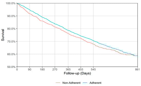 The eventual need for hospitalization in older adults with co-existing dementia and depression has been reported in previous studies [25,26,27,28,29]. A National Health and Aging Trends Study conducted with 7179 American older adults (aged 65 and above) found that being hospitalized in the prior year was associated with an odds ratio of 1.42 of probable dementia and an odds ratio of 1.6 of substantial depressive symptoms [25]. However, this study utilized a cross-sectional design, limiting its ability to establish causality. Another study using a nationally representative older population in Taiwan observed that participants with depressive symptoms, cognitive impairment, falls, and urinary incontinence had significantly more hospital admissions (incidence rate ratio = 1.34) and more hospital bed days (incidence rate ratio = 1.72) compared to participants without these conditions [29]. The authors also found the prevalence of aforementioned geriatric syndromes amongst their study population to be 56.3%, highlighting the high healthcare burden. A prospective cohort study using American participants enrolled in the Health and Retirement Study established that depression (Hazard Ratio (HR) = 1.33) and dementia (HR = 1.32) are independently associated with a risk of potentially preventable hospitalizations, and the risk is magnified in adults with comorbid depression and dementia (HR = 1.66) [26]. Our study further stratified these findings between acute- and continuation-phase AMM parameters and found that the only statistically significant difference existed in the acute phase of treatment, with a median time of 530 days in the adherent population and 425 days in the non-adherent population. No significant difference was found for all-cause hospitalization in the continuation phase. This may suggest that early adherence is integral in achieving favorable outcomes and preventing potential hospitalizations, and there may be a specific window of time during treatment in which AMM effects are optimized.