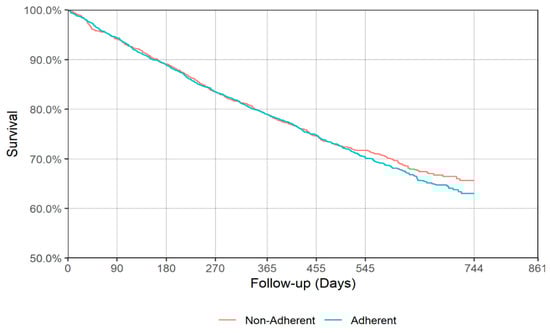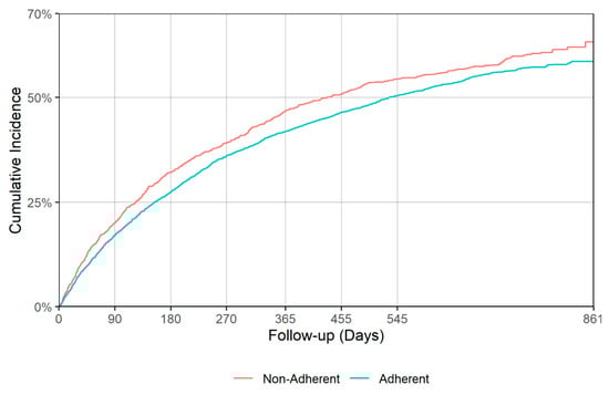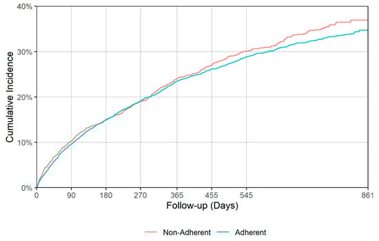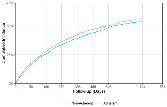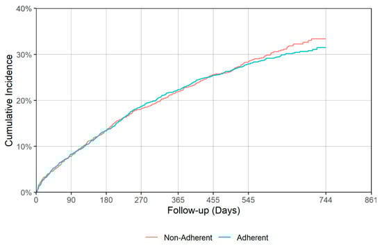 Due to violation of the proportionality assumption inherent in Cox models, we opted to employ fully non-parametric analyses. For all-cause mortality, survival was estimated using the Kaplan–Meier model and the weighted log-rank test was used to test of differences in survival curves between adherent and non-adherent groups. For hospitalization and falls/fractures outcomes, cumulative incidence functions (CIF) were plotted, and the modified Grey’s test [21] was used to compare the curves between adherent and non-adherent groups. For all outcomes, observations were censored at the time of discontinuation of continuous Medicare coverage or addition of Health Maintenance Organizations (HMO) coverage if these occurred prior to the outcome of interest.