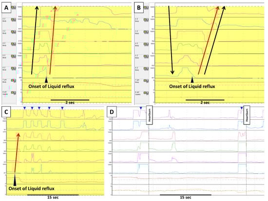 Gastric belching and supragastric belching in impedance–pH monitoring. Each row in impedance–pH tracings measures, from the bottom, gastric pH; esophageal pH at 5 cm above the lower esophageal sphincter (LES); and impedance at 3, 5, 7, 9, 15, and 17cm above the LES. In GB (A), an increase of impedance, indicating air from the stomach, moves retrogradely from the distal to the proximal esophagus. This GB is immediately followed by a liquid reflux episode (i.e., retrograde impedance decrease). On the other hand, SGB (B) starts with antegrade movement of impedance increase by sucking or swallowing air from the pharynx; subsequently, such increase returns to baseline retrogradely by abdominal straining. This SGB induces a liquid reflux episode. Apart from the SGB inducing reflux, there are two other patterns of the relationship between SGB and reflux. (C) shows that several SGBs (blue arrowheads) occur during liquid reflux in which an uncomfortable sensation by reflux might lead a patient to perform SGBs. (D) shows SGBs (blue arrowheads) without reflux. In this case, a patient constantly marked heartburn immediately after SGBs, which suggests the SGBs caused reflux symptoms by esophageal distension. Black arrows indicate the movement of air, whereas red arrows indicate liquid reflux.