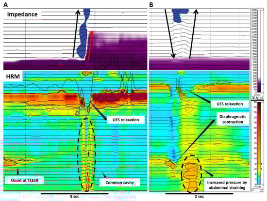 Gastric belching and supragastric belching in HRM combined with impedance. These pictures illustrate GB (A) and SGB (B) in simultaneous recording of impedance and HRM. (A) A GB occurs with liquid reflux during TLESR. GB can be recognized as a common cavity in HRM. The air evacuates from the stomach to the pharynx through the relaxed UES. (B) In SGB, the contraction of the diaphragm generates negative pressure in the esophagus. UES relaxation lets air into the esophagus followed by expelling the air by abdominal straining. No peristalsis is involved with the air movement in SGB. Black arrows indicate the movement of air whereas red arrows indicate liquid reflux. HRM; high resolution manometry, TLESR; transient lower esophageal sphincter relaxation, UES; upper esophageal sphincter.