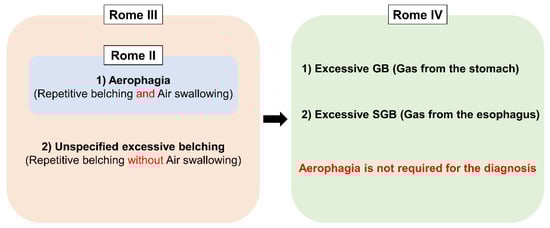 Excessive belching was initially thought to be a consequence of aerophagia (frequent air swallowing) []. Therefore, Rome II defined excessive belching as a part of “Aerophagia”. The advent of intraluminal impedance monitoring enabled us to assess both the type and movement of bolus in the esophagus (i.e., gas or liquid, and antegrade or retrograde movement) [,]. With this technique, Bredenoord et al. found a novel type of belching named supragastric belching (SGB) []. This finding brought research about belching into the next level because, until this study, all the belching had been considered as gastric belching. Consequently, Rome III expanded the disease concept by adding “unspecified excessive belching (i.e., excessive belching without air swallowing)” as the other subcategory apart from “aerophagia”, and renamed the disorder as “Belching Disorders” []. At that time, the two terms, “aerophagia” and “SGB”, were used in a bewildering way since SGB was thought to be found only in “aerophagia” []. However, the two disorders have been segregated from each other recently because they have distinctive features or physiology. In aerophagia, esophageal peristalsis propels swallowed air, which ends up accumulating in the intestine and colon. It mainly manifests itself as bloating, abdominal distention and constipation, although some patients complain of PPI refractory GERD symptoms []. On the other hand, SGB does not involve any esophageal peristalsis, and swallowed air does not reach the stomach [,]. Nevertheless, aerophagia still lacks clear diagnostic criteria to distinguish from normal air swallowing. The latest Rome IV removed the term “Aerophagia” from “Belching disorders” in which belching was simply classified into excessive GB and SGB on the basis of the origin of the gas [] (Figure 3).